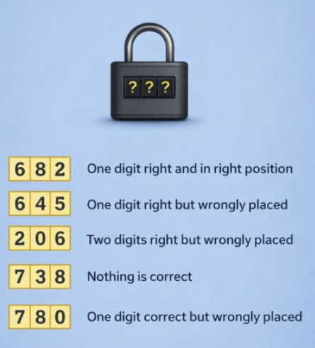 Your friend has a padlock and has set a three-digit combination. You make the above guesses and receive the corresponding feedback. You are down to your last guess. What is the combination?